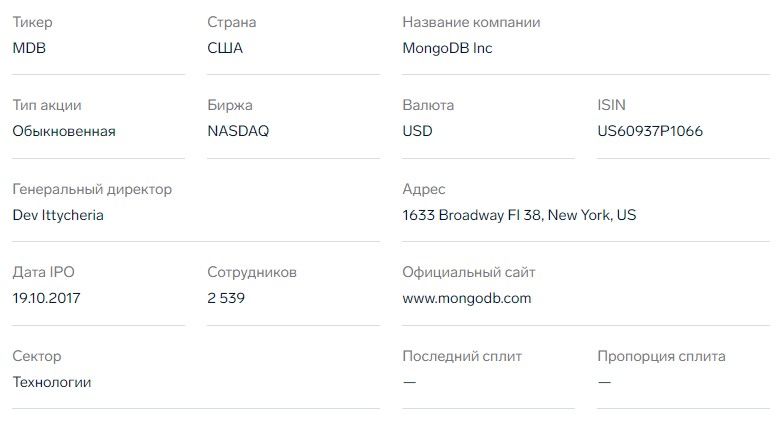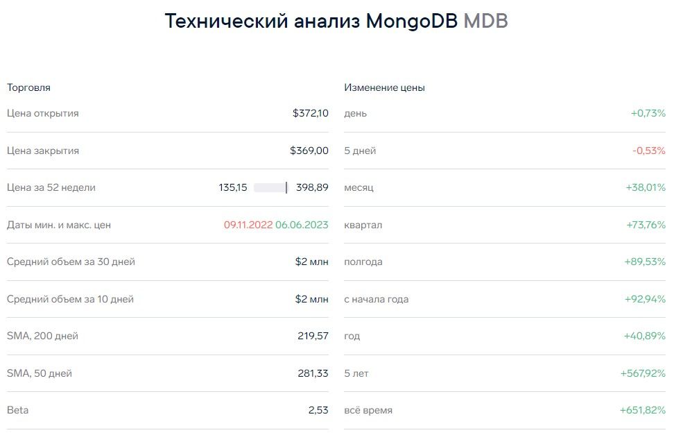 Цена бумаг MongoDB за месяц изменилась на +38,01%, за год изменилась на +40,89%. Диапазон цен за 52 недели составил $135,15 — $398,89