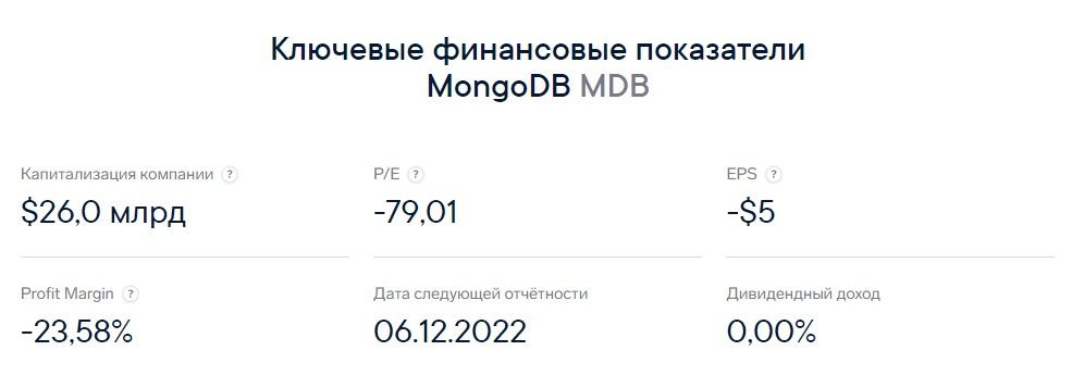 Текущий P/E MongoDB составляет -79,01. Прогнозируемый аналитиками P/E через год — -1 487,06. Выручка компании $1 млрд, выручка на акцию составила $19,37. Текущий долг — $1 млрд. MongoDB отчитались о прибыли (EBITDA) в -$309 млн